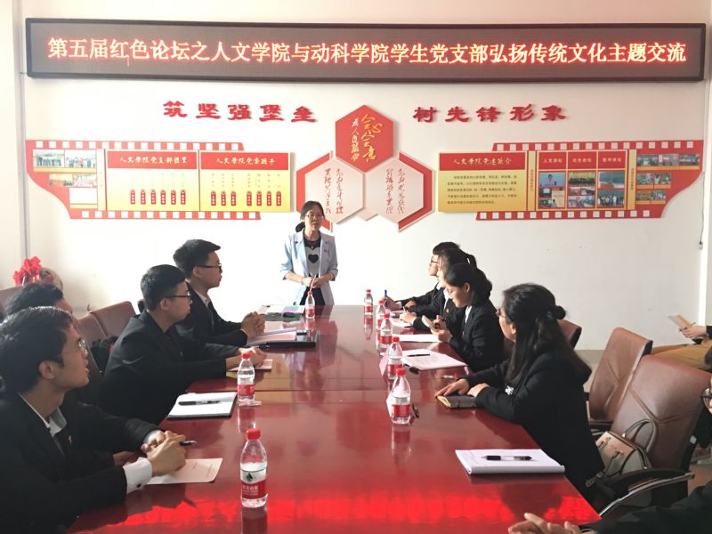 5月23日,人文学院本科生党支部与动物科技学院员工第二党支部进行党支部合作共建活动,本次活动依托红色论坛,围绕弘扬传统文化主题进行学习交流。人文学院本科生第一党支部书记、动物科技学院员工第二党支部书记、组织委员及40余名党员参加活动。分别介绍了人文学院红色论坛的开展情况,动物科技学院开展合作共建的主旨与党支部建设情况。