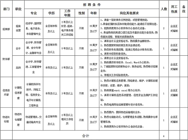 2020年度下半年湖州保税物流中心有限公司人员需求计划表