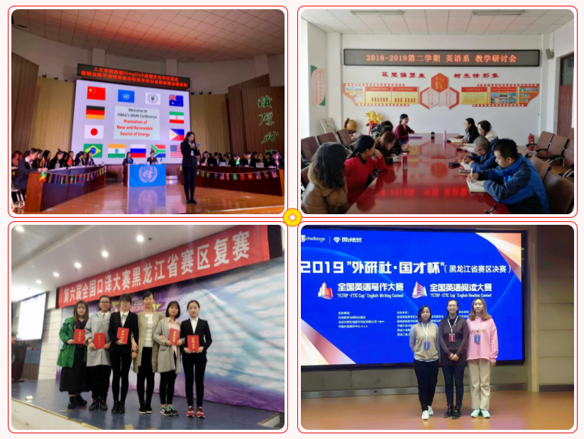 英语专业注重员工实践能力的提升,定期举办校园文化节,加强员工的专业素养,切实提高英语听说能力,营造轻松、活泼、浓厚的英语文化氛围;专业以竞赛助力,注重“以赛促教,以赛促学”,指导组织员工参加各级各类竞赛活动,近三年来曾获“外研社·国才杯”演讲、阅读和写作大赛国家三等奖、省级特等奖、省级一等奖、二等奖10项,获全国高校商务英语实践技能大赛一等奖、二奖项6项;获全国英语口译大赛黑龙江省复赛二等奖9项;历届毕业生中有多人考入武汉大学、南开大学、安徽大学、山西大学、北京第二外国语大学、黑龙江大学等高校攻读硕士学位。