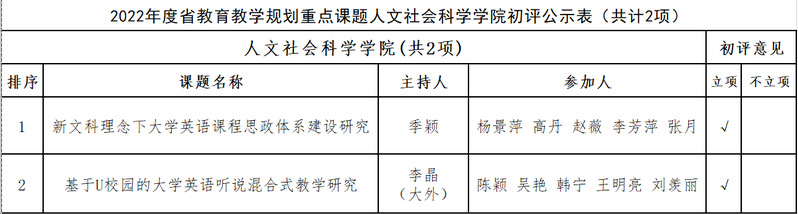 根据《黑龙江省教育科学规划领导小组办公室关于组织申报高等教育2022年度省教育科学规划重点课题工作的通知》(黑教科规办[2021]10号)及学校要求,经个人申请、学院组织专家评审,现将拟推荐申报2022年度省教育科学规划重点课题的结果公示如下: