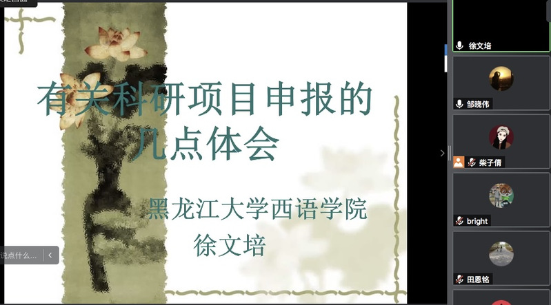 建院二十周年之际,12月15日晚,人文学院特邀请黑龙江大学西语学院经理徐文培教授于腾讯会议开展线上“有关科研项目申报的几点体会”专题讲座。本次讲座由副经理邹晓伟教授主持,经理田恩铭教授致欢迎辞,李永亮书记、人文学院及兄弟学院教师70余人参加聆听。