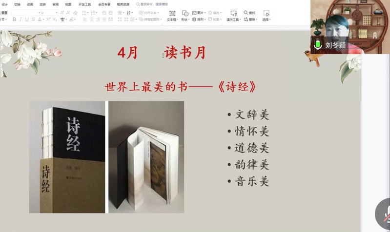 讲座伊始,刘冬颖教授借4月读书月契机,引出本次讲座的主题“世界上最美的书——《诗经》”,用温婉的语调、优美流畅的语言,把大家带入到一个宁静美好的国学世界。刘教授从孔子与音乐的渊源、孔子与《诗经》的关系,《诗经》对后世的影响,由今溯古,道出了《诗经》的重要地位。随后,她又通过文辞美、情怀美、道德美、韵律美、音乐美等几个方面,以丰富扎实的古文献知识、生动形象的语言和幽默风趣的讲述方式,对《诗经》名篇进行了深入浅出的解读,充分展示了《诗经》究竟美在何处。在聆听刘教授的弦歌吟唱中大家进行了一段从音乐角度品读《诗经》的美妙美育之旅。