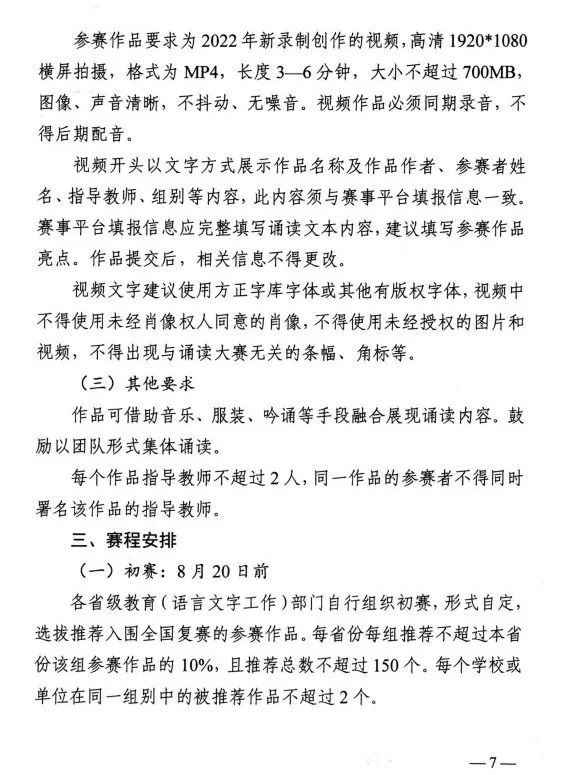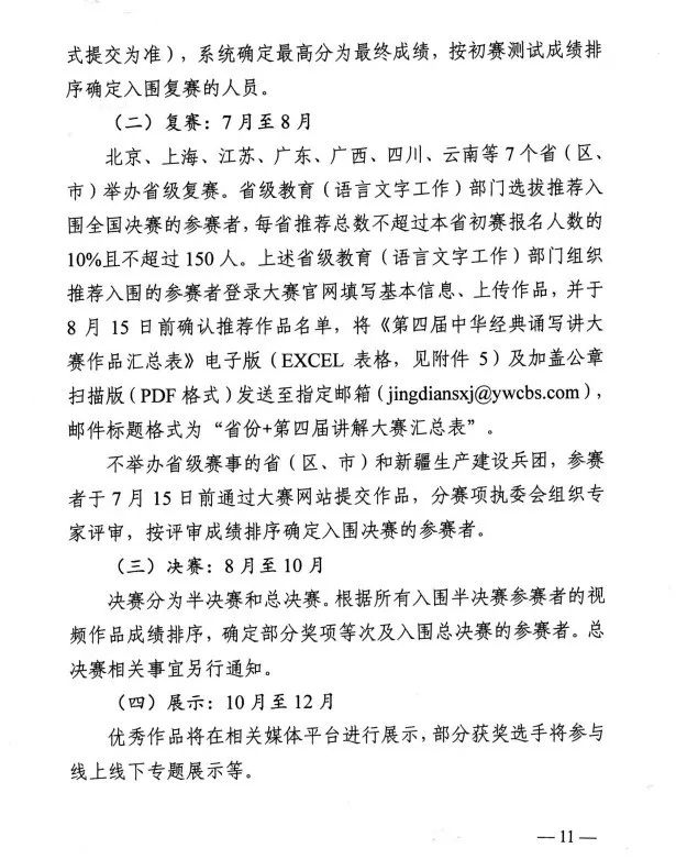 诵读大赛由各省(区、市)和新疆生产建设兵团组织初赛。各省级教育(语言文字工作)部门根据实际情况自行确定组织方式,选拔推荐入围复赛作品、上传官网,并提交入围复赛参赛者基本信息(填报表格见附件5)。