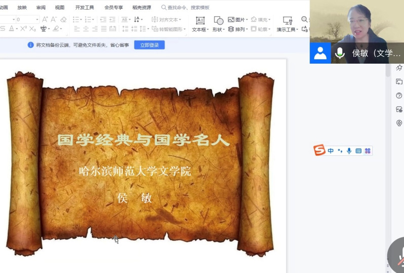 在“世界读书日”到来之际,为创建优良学风,营造读书氛围浓厚的书香校园,丰富师生在疫情防控严峻时期的学习生活,4月16日上午,人文学院特邀请哈尔滨师范大学侯敏教授开展线上“国学大讲堂”第二场之“国学经典与国学名人”专题讲座。本次讲座由经理田恩铭教授主持,学院领导及师生代表等230余人参加。