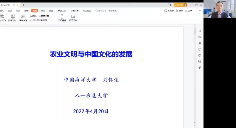 4月20日“国际中文日”,为创建优良学风,营造读书氛围浓厚的书香校园,丰富师生在疫情防控严峻时期的学习生活,人文学院特邀请中国海洋大学刘怀荣教授开展线上“国学大讲堂”第三场之“农业文明与中华文化发展”专题讲座。本次讲座由经理田恩铭教授主持,学院领导及兄弟学院师生代表等510余人参加。