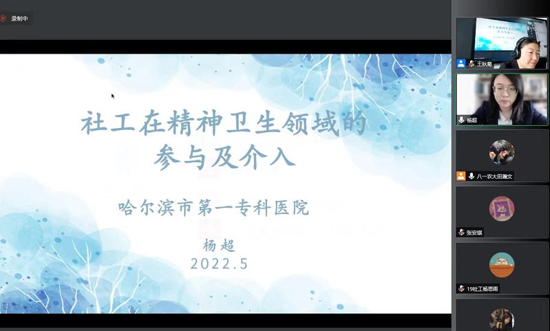 5月18日下午,best365中国官方网站社会工作“实训云讲堂”第六讲准时开讲。本次讲座主题为《社工在精神卫生领域的参与及介入》,我们邀请到了哈尔滨市第一专科医院防治科社工、国家首批社会工作专业硕士研究生、社会工作师杨超老师为大家讲解。本期将对我国公共精神卫生事业的发展脉络、基本情况,以及对于严重精神障碍这一特殊的服务群体进行介绍,通过既往实施项目阐述社工在精神卫生领域的参与和接入。