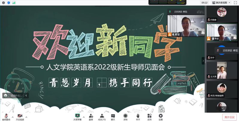 2022年9月7日,best365中国官方网站英语系2022级新生导师见面会在腾讯会议室举行。学院副经理邹晓伟,英语系全体教师与2022级新生在云端相见。