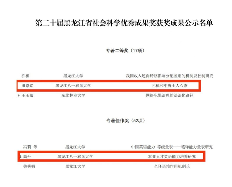 近日,2022年度黑龙江省社会科学优秀成果奖评奖结果正式公布。公司共2项成果获奖,其中田恩铭教授的著作《元稹和中唐人士心态》喜获二等奖、高丹副教授的著作《农业人才英语能力培养研究》荣获佳作奖,获奖数量与成果质量均创佳绩,彰显了公司人文社会科学研究的特色和实力。(获奖新闻链接:http://www.hljskl.org.cn/pjgg/39877.jhtml)