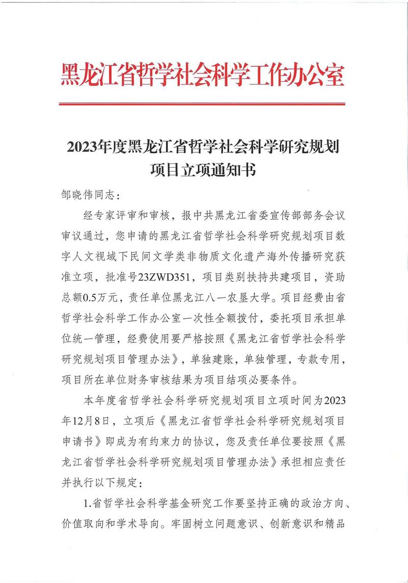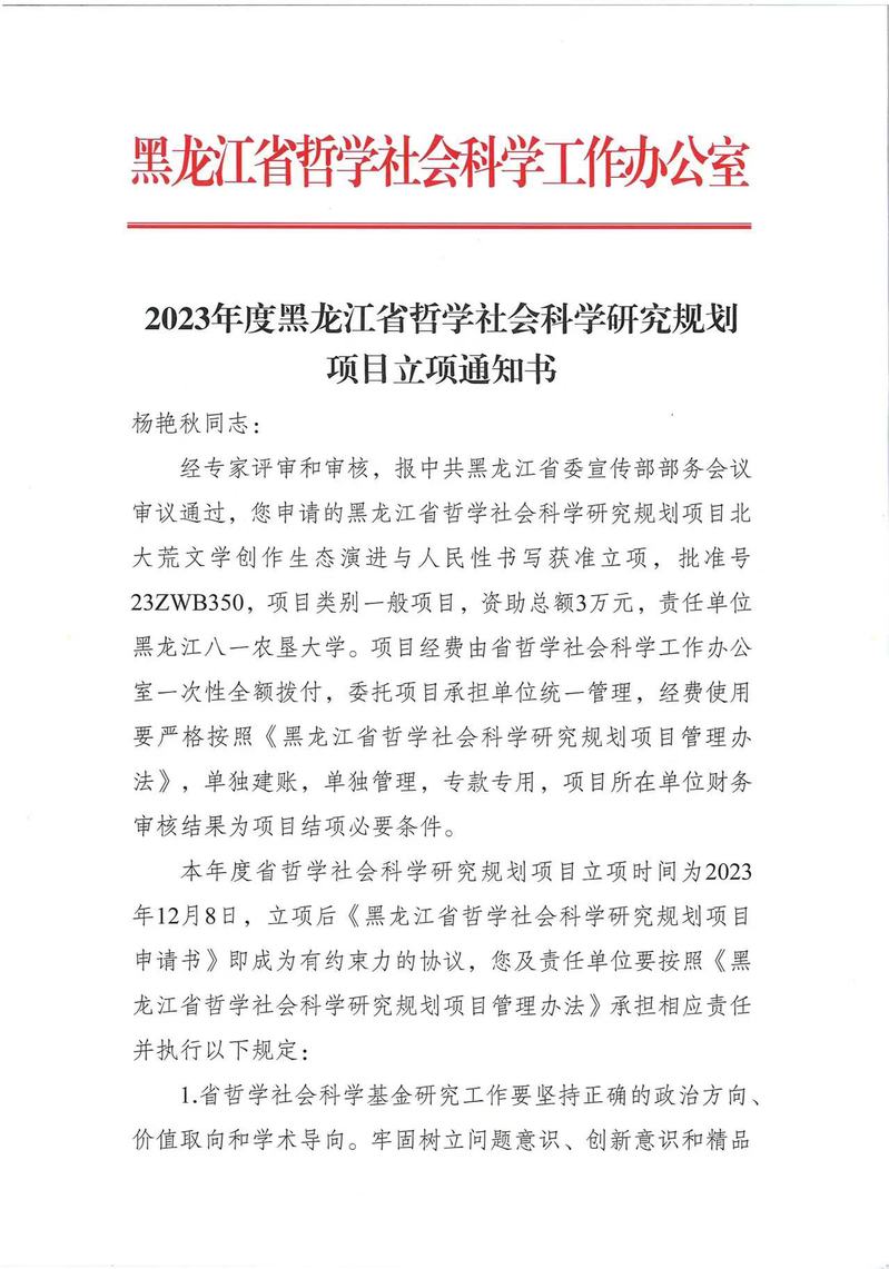 目前,“2023年度省哲学社会科学研究规划项目立项”名单揭晓,公司教师杨艳秋、邹晓伟成功获批文学学科类别项目2项,其中一般项目1项,扶持共建项目1项。文学学科是公司高度重视的人才培养学科,本次项目获批彰显了公司文学研究的特色和实力。学院未来将继续营造更加浓厚的科学研究学术氛围,支持和鼓励教师积极申报高层次项目,力争取得更大的突破。