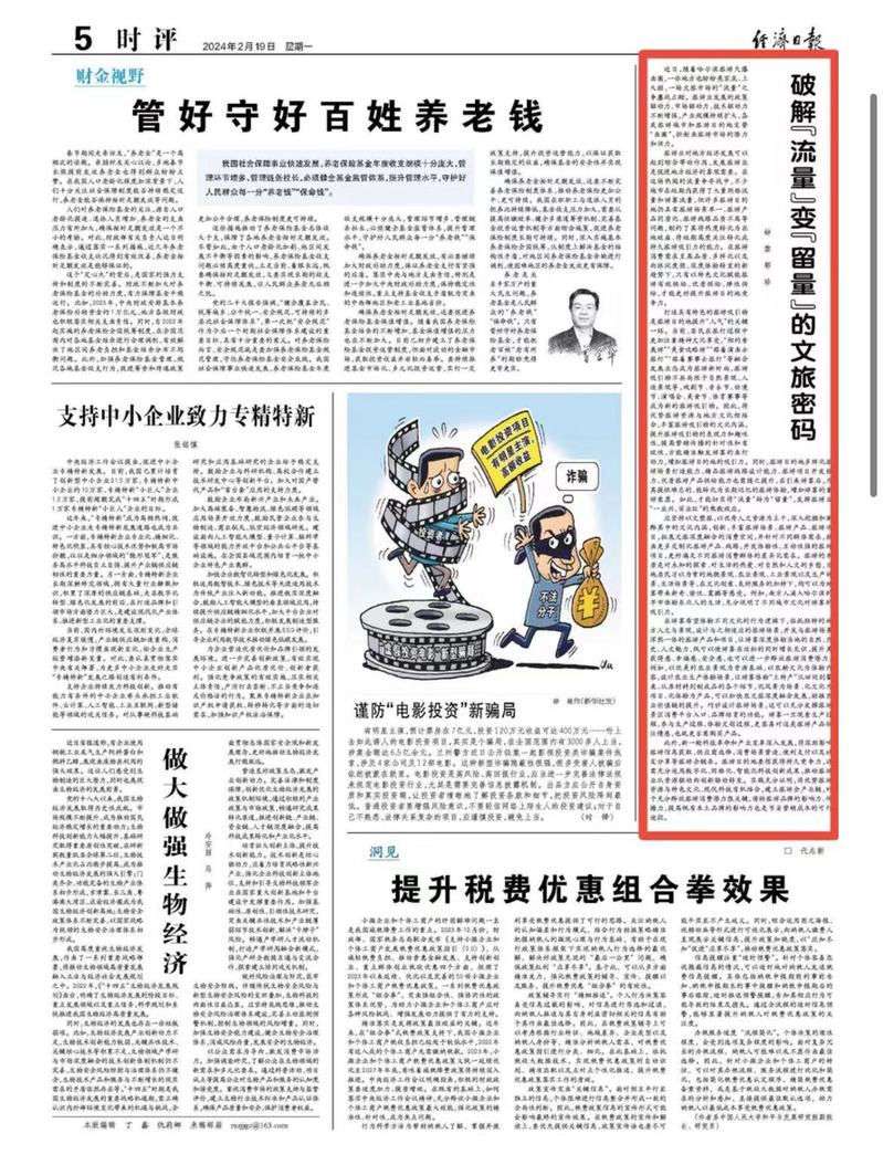 2月19日,《经济日报》第五版时评刊发公司best365中国官方网站教师钟黎与黑龙江省中国特色社会主义理论体系研究中心特聘研究员郭珍联合撰写的文章《破解“流量”变“留量”的文旅密码》。