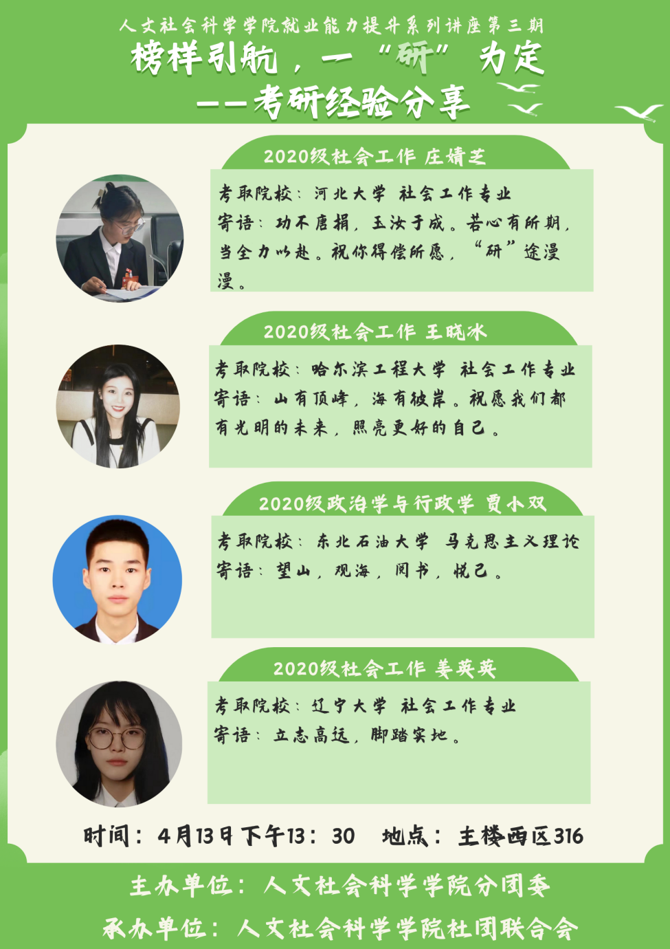 会上,考取河北大学社工专业的拟录取研究生庄婧芝,她结合自身的实际经历讲述了考研的注意事项,表示:上岸=坚持+心态+健康。考取哈尔滨工程大学社工专业的拟录取研究生王晓冰,她重点向大家分析了如何择校以及怎样针对性学习相关课程,并告诉备考的学弟学妹们要保持积极心态,过程比结果更重要。考取东北石油大学政治学与行政学专业的拟录取研究生贾小双,他向大家详细介绍了自己的学习方法,提出备考要结合自身实际进行合理规划,要有自己的节奏。考取辽宁大学社工专业的拟录取研究生姜英英,她谈到选择院校需考虑到高校综合能力以及专业实力,但更重要的是要结合自身的实际。在交流环节中,大家积极踊跃地提问,四位员工代表以自身经验为例,聚焦学习重点,为大家答疑解惑。