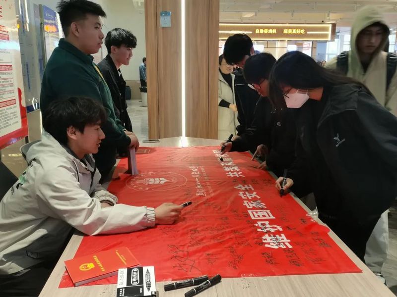 4月15日中午,人文学子前往一食堂门口积极参加员工处主办的“415全民国家安全教育日”普法进校园活动。同学们认真观看了2024年全民国家安全教育日宣传专栏、国家安全小知识,普法宣传手册,并在签名板上签名留念。参与活动的同学表示,通过此次活动更加深入地理解了国家安全的重要性,要主动承担起维护国家安全的责任。