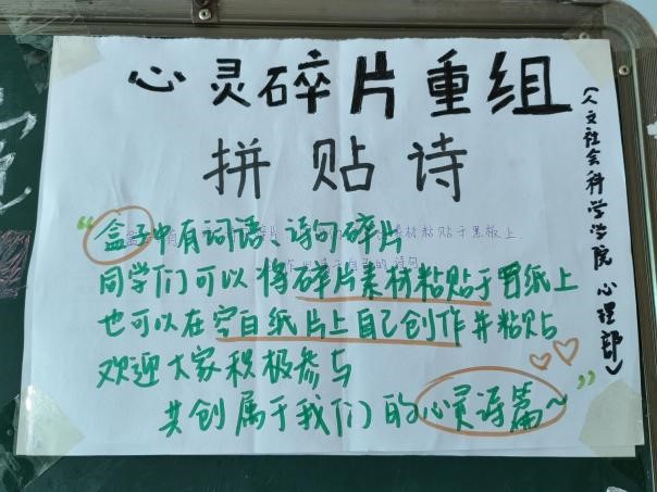 6月1日至2日,公司第二课堂服务中心心理部在六、七号楼宿舍大厅开展了“心灵碎片重组拼贴诗”活动,本次活动旨在引导同学们认识自我、展示自我,通过拼贴诗的形式探索内心世界,以诗会友,在诗歌中表达真实自我,实现人与人之间心灵的碰撞、情感的交流,维护心理健康,共同营造一个美好的人文大家庭!