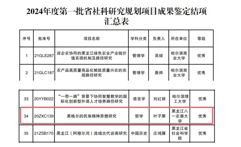 日前,“2024年度第一批黑龙江省社科研究规划项目成果鉴定结项”公示名单揭晓,公司汉语言文学专业青年教师叶子犀主持的青年项目《黑格尔的民族精神思想研究》,以优秀等级结项。