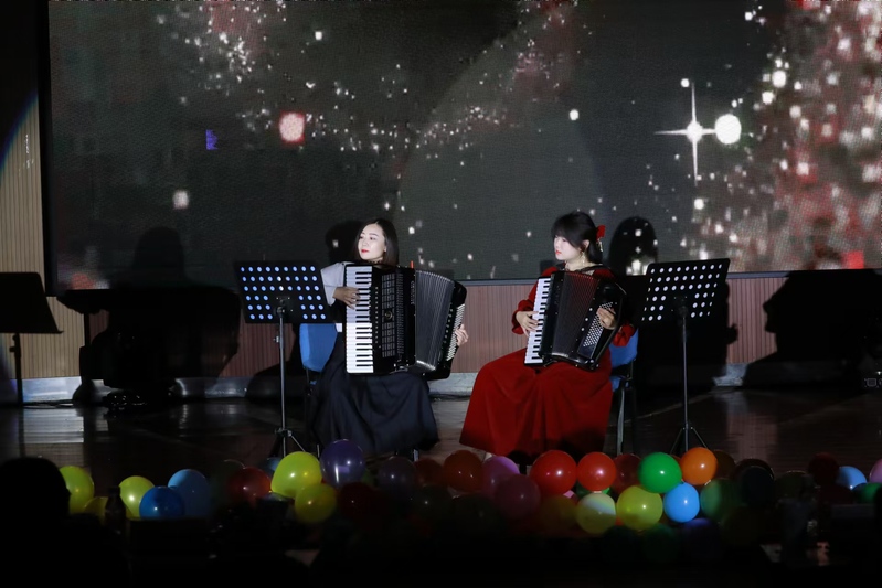 常慧老师与刘耀鸿同学倾情演奏手风琴二重奏《山楂树》,悠扬婉转的琴声萦绕在大家耳边,温暖着在场师生们的心灵。