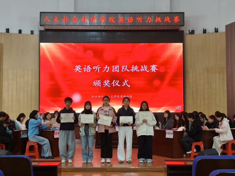 本次比赛设置填空题、对话理解题、英文复述题三大模块。经过前两轮紧张有序的必答与抢答环节,六支队伍比分始终紧咬,难分胜负。最终环节的英文复述题全面考察选手的听力理解精准度、语言组织流畅性及临场应变敏捷性。各队屏息凝神展开白热化角逐,以迅捷精准的抢答将赛事气氛推向高潮。经过三轮扣人心弦的较量,英语24级1班团队凭借稳定发挥拔得头筹,其余队伍亦以默契协作彰显了青春风采。